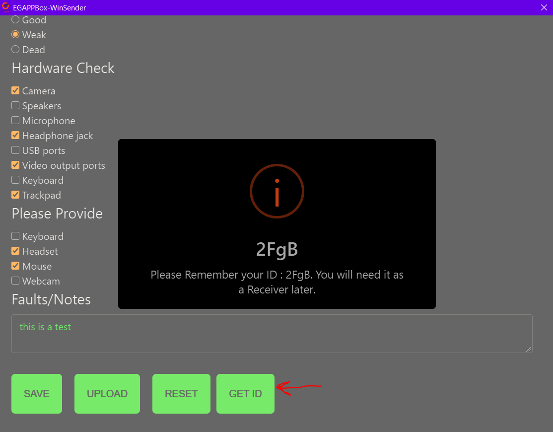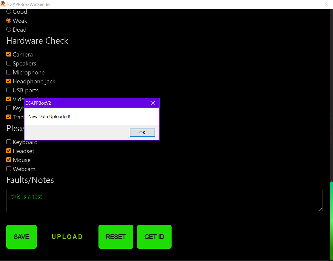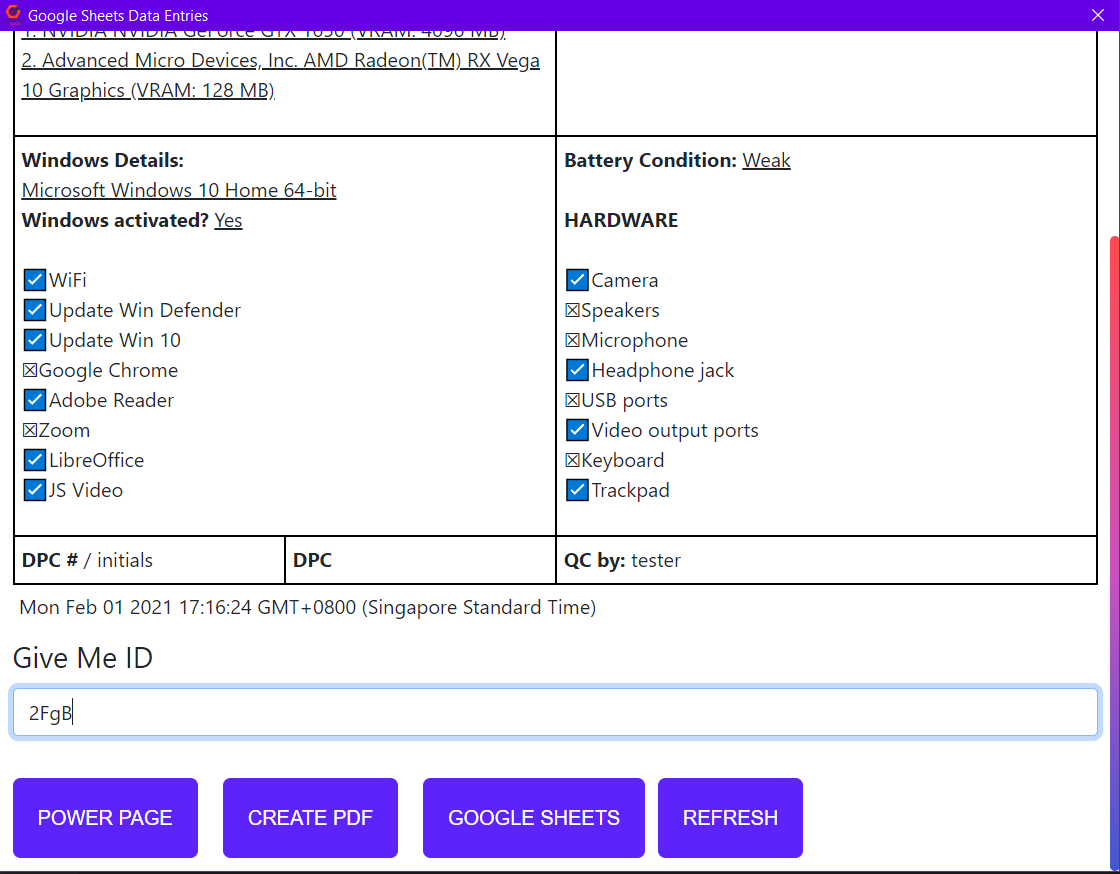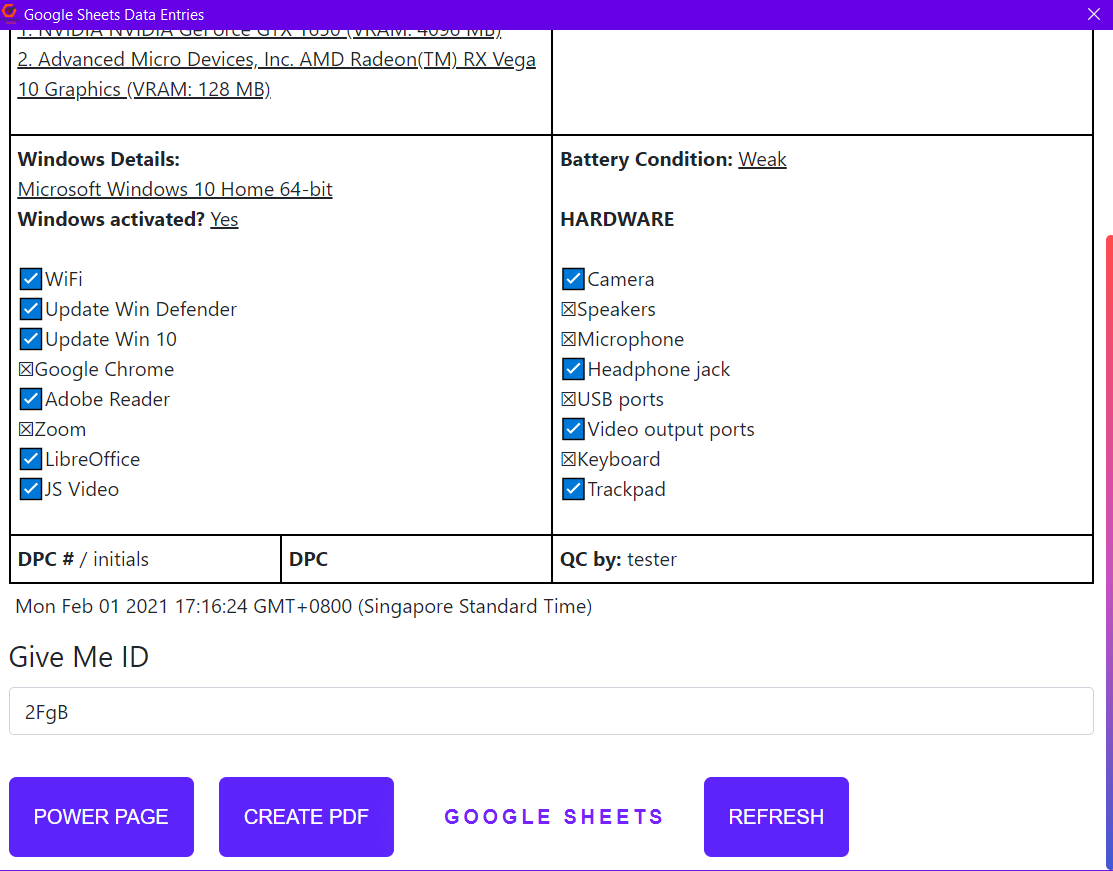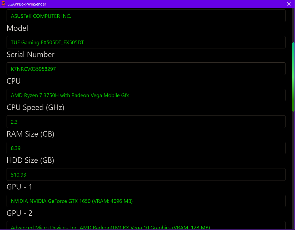 Record the PC details and send it to EG Google Sheets. There is "Sender" and "Receiver" Roles in the main page. Each carries out different functions.
